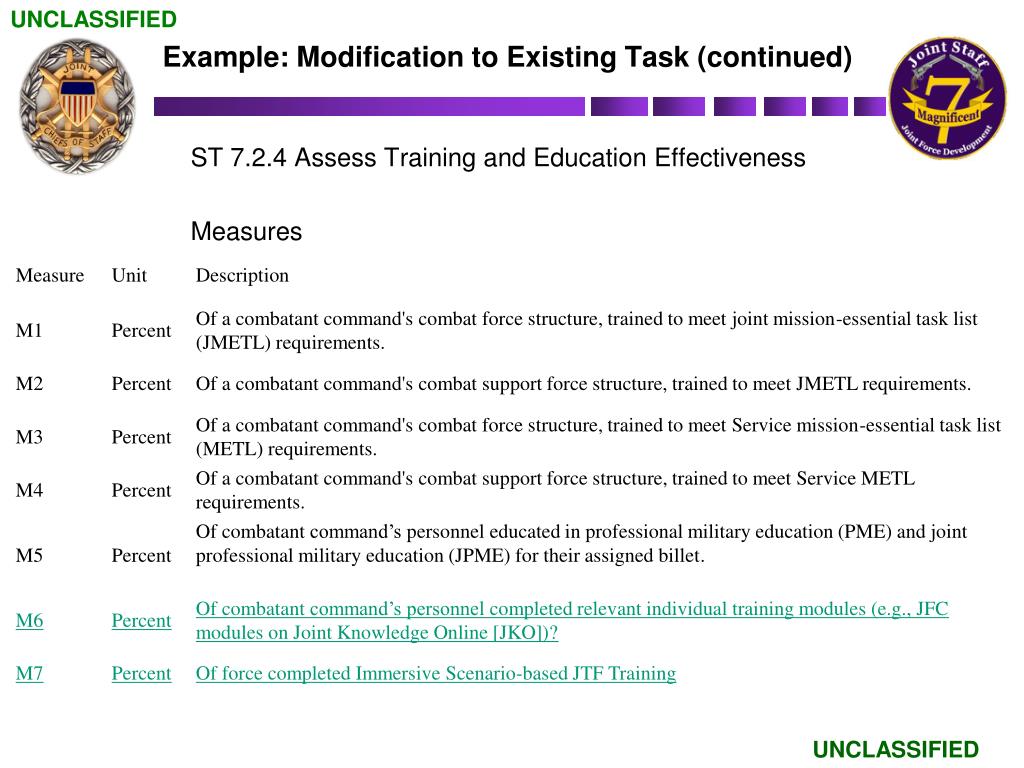 Example: Modification to Existing Task (continued) ST 7.2.4 Assess Training and Education Effectiveness Measures