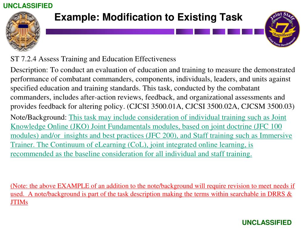 Example: Modification to Existing Task ST 7.2.4 Assess Training and Education Effectiveness Description:To conduct an evaluation of education and training to measure the demonstrated performance of combatant commanders, components, individuals, leaders, and units against specified education and training standards. This task, conducted by the combatant commanders, includes after-action reviews, feedback, and organizational assessments and provides feedback for altering policy. (CJCSI 3500.01A, CJCSI 3500.02A, CJCSM 3500.03) Note/Background: This task may include consideration of individual training such as Joint Knowledge Online (JKO) Joint Fundamentals modules, based on joint doctrine (JFC 100 modules) and/or insights and best practices (JFC 200), and Staff training such as Immersive Trainer. The Continuum of eLearning (CoL), joint integrated online learning, is recommended as the baseline consideration for all individual and staff training. (Note: the above EXAMPLE of an addition to the note/background will require revision to meet needs if used. A note/background is part of the task description making the terms within searchable in DRRS & JTIMs
