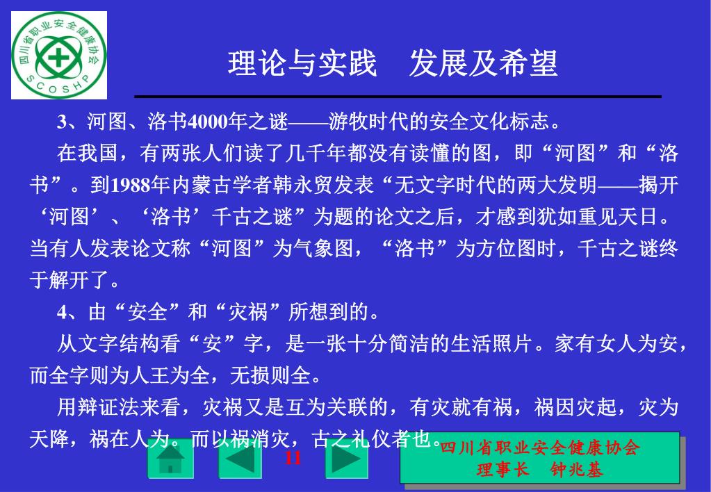 3、河图、洛书4000年之谜——游牧时代的安全文化标志。3、河图、洛书4000年之谜——游牧时代的安全文化标志。 • 在我国,有两张人们读了几千年都没有读懂的图,即“河图”和“洛书”。到1988年内蒙古学者韩永贸发表“无文字时代的两大发明——揭开‘河图’、‘洛书’千古之谜”为题的论文之后,才感到犹如重见天日。当有人发表论文称“河图”为气象图,“洛书”为方位图时,千古之谜终于解开了。 • 4、由“安全”和“灾祸”所想到的。 • 从文字结构看“安”字,是一张十分简洁的生活照片。家有女人为安,而全字则为人王为全,无损则全。 • 用辩证法来看,灾祸又是互为关联的,有灾就有祸,祸因灾起,灾为天降,祸在人为。而以祸消灾,古之礼仪者也。 四川省职业安全健康协会 理事长 钟兆基