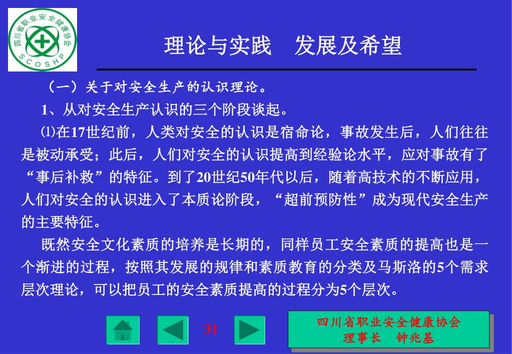 从美国马斯洛的人本哲学中有一句很著名的话:人是一种不断需求的动物,除短暂的时间外,极少达到完全满足的状况,一个欲望满足后,往往又会被另一个欲望所占领。人几乎整个一生都总是在希望什么,因而也引发了一切……“而这个诊断在于它的一切都首先满足于人类自身的安全,在安全的状况基本满足的前提下来提出另一个目标,从而使安全文化伴随着整个人类的发展而发展着。从美国马斯洛的人本哲学中有一句很著名的话:人是一种不断需求的动物,除短暂的时间外,极少达到完全满足的状况,一个欲望满足后,往往又会被另一个欲望所占领。人几乎整个一生都总是在希望什么,因而也引发了一切……“而这个诊断在于它的一切都首先满足于人类自身的安全,在安全的状况基本满足的前提下来提出另一个目标,从而使安全文化伴随着整个人类的发展而发展着。 • (三)当前严峻的安全生产形势要求把安全文化建设纳入各级政府和企业的工作范围。 • 安全生产总的方针,党中央、国务院已经明确:“安全第一、预防为主、综合治理”。 • 当前我国、我省安全生产形势可以用三句话来概括:即总体平稳、局部好转;形势严峻,问题不少;任重道远,松懈不得。 四川省职业安全健康协会 理事长 钟兆基