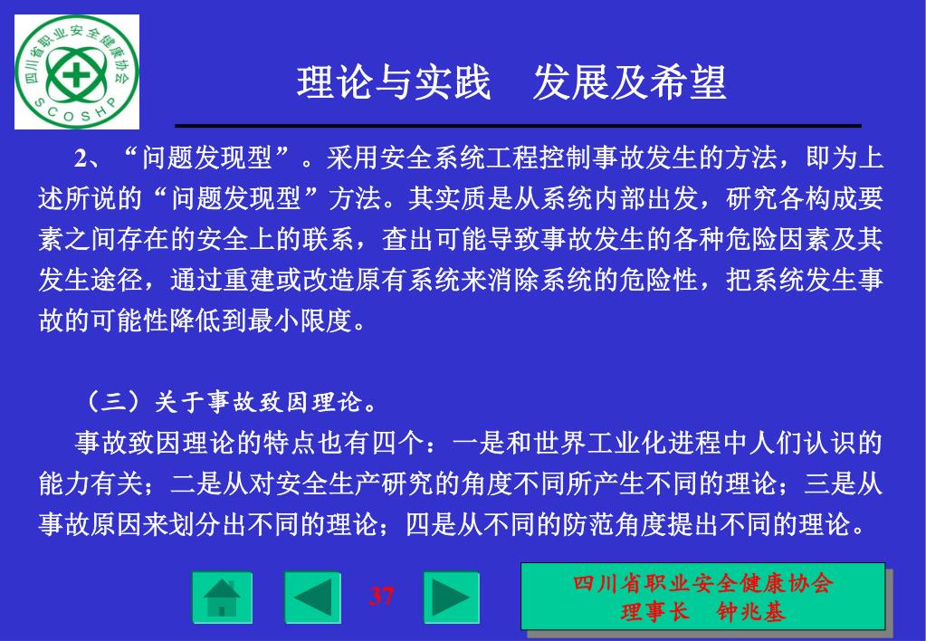 2、“问题发现型”。采用安全系统工程控制事故发生的方法,即为上述所说的“问题发现型”方法。其实质是从系统内部出发,研究各构成要素之间存在的安全上的联系,查出可能导致事故发生的各种危险因素及其发生途径,通过重建或改造原有系统来消除系统的危险性,把系统发生事故的可能性降低到最小限度。2、“问题发现型”。采用安全系统工程控制事故发生的方法,即为上述所说的“问题发现型”方法。其实质是从系统内部出发,研究各构成要素之间存在的安全上的联系,查出可能导致事故发生的各种危险因素及其发生途径,通过重建或改造原有系统来消除系统的危险性,把系统发生事故的可能性降低到最小限度。 • (三)关于事故致因理论。 • 事故致因理论的特点也有四个:一是和世界工业化进程中人们认识的能力有关;二是从对安全生产研究的角度不同所产生不同的理论;三是从事故原因来划分出不同的理论;四是从不同的防范角度提出不同的理论。 四川省职业安全健康协会 理事长 钟兆基