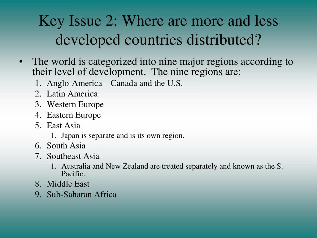 Key Issue 2: Where are more and less developed countries distributed? • The world is categorized into nine major regions according to their level of development. The nine regions are: • Anglo-America – Canada and the U.S. • Latin America • Western Europe • Eastern Europe • East Asia • Japan is separate and is its own region. • South Asia • Southeast Asia • Australia and New Zealand are treated separately and known as the S. Pacific. • Middle East • Sub-Saharan Africa