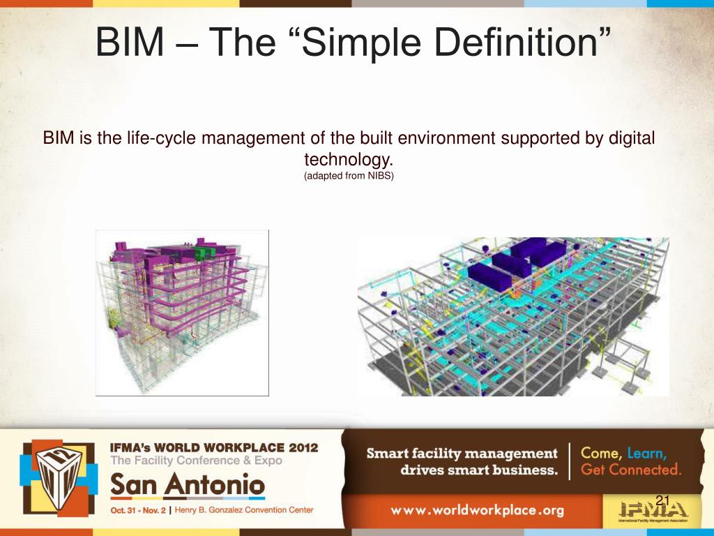 BIM – The “Simple Definition” BIM is the life-cycle management of the built environment supported by digital technology. (adapted from NIBS)