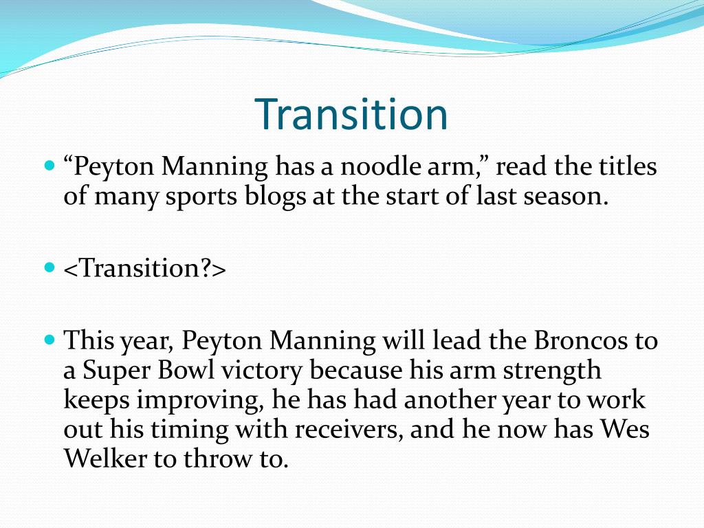 Transition • “Peyton Manning has a noodle arm,” read the titles of many sports blogs at the start of last season. • <Transition?> • This year, Peyton Manning will lead the Broncos to a Super Bowl victory because his arm strength keeps improving, he has had another year to work out his timing with receivers, and he now has Wes Welker to throw to.
