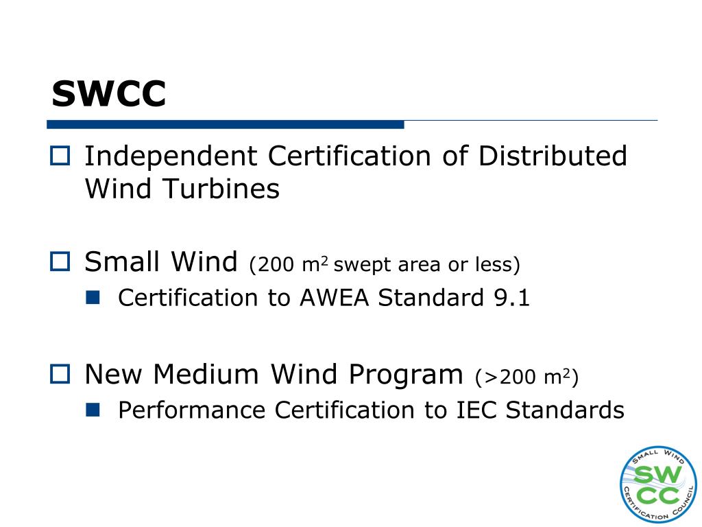 SWCC • Independent Certification of Distributed Wind Turbines • Small Wind (200 m2 swept area or less) • Certification to AWEA Standard 9.1 • New Medium Wind Program (>200 m2) • Performance Certification to IEC Standards