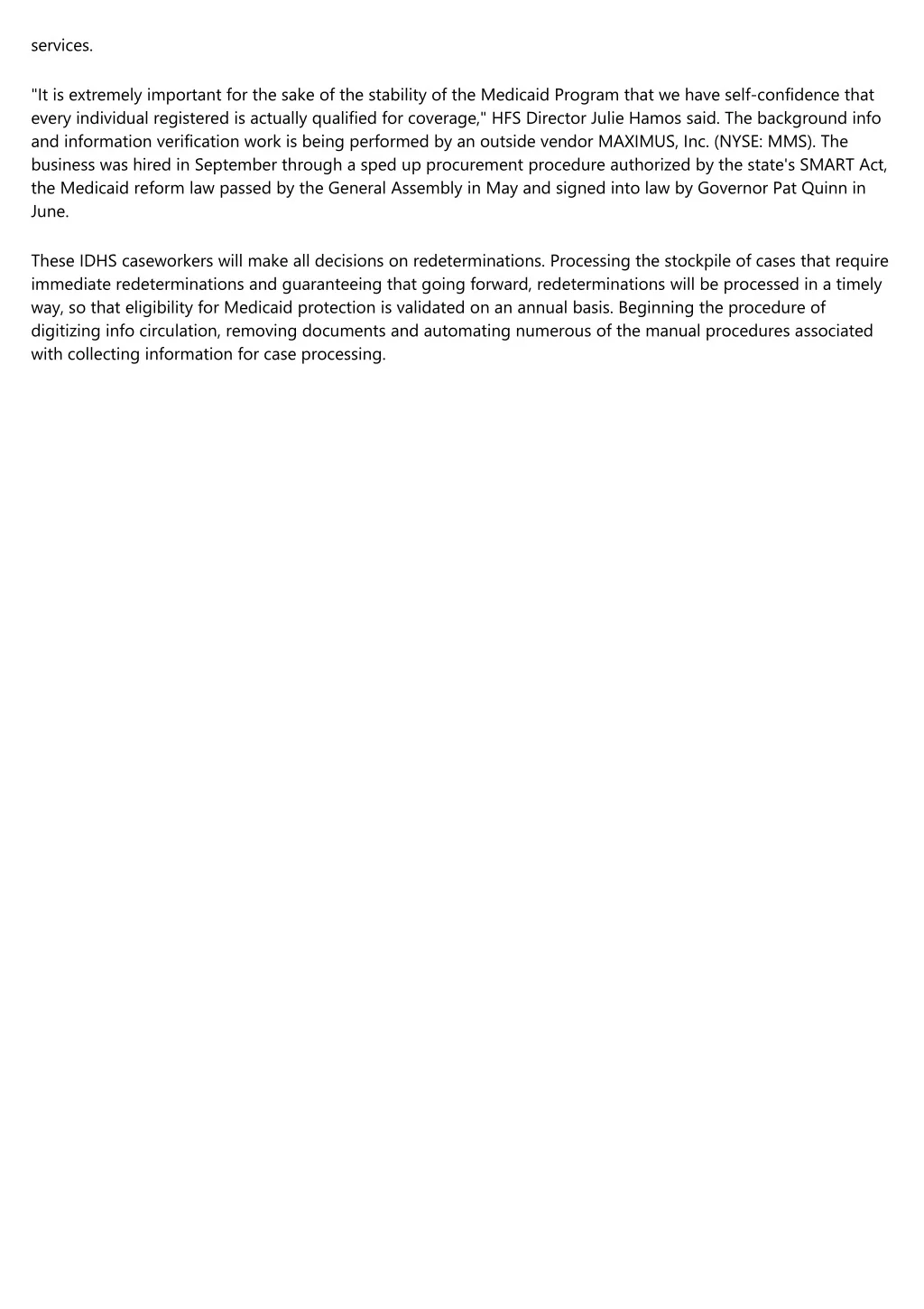 3. services. "It is extremely important for the sake of the stability of the Medicaid Program that we have self-confidence that every individual registered is actually qualified for coverage," HFS Director Julie Hamos said. The background info and information verification work is being performed by an outside vendor MAXIMUS, Inc. (NYSE: MMS). The business was hired in September through a sped up procurement procedure authorized by the state's SMART Act, the Medicaid reform law passed by the General Assembly in May and signed into law by Governor Pat Quinn in June. These IDHS caseworkers will make all decisions on redeterminations. Processing the stockpile of cases that require immediate redeterminations and guaranteeing that going forward, redeterminations will be processed in a timely way, so that eligibility for Medicaid protection is validated on an annual basis. Beginning the procedure of digitizing info circulation, removing documents and automating numerous of the manual procedures associated with collecting information for case processing.