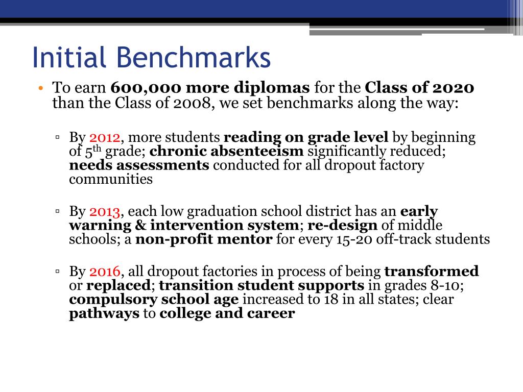 Initial Benchmarks • To earn 600,000 more diplomas for the Class of 2020 than the Class of 2008, we set benchmarks along the way: • By 2012, more students reading on grade level by beginning of 5th grade; chronic absenteeism significantly reduced; needs assessments conducted for all dropout factory communities • By 2013, each low graduation school district has an early warning & intervention system; re-design of middle schools; a non-profit mentor for every 15-20 off-track students • By 2016, all dropout factories in process of being transformed or replaced; transition student supports in grades 8-10; compulsory school age increased to 18 in all states; clear pathways to college and career