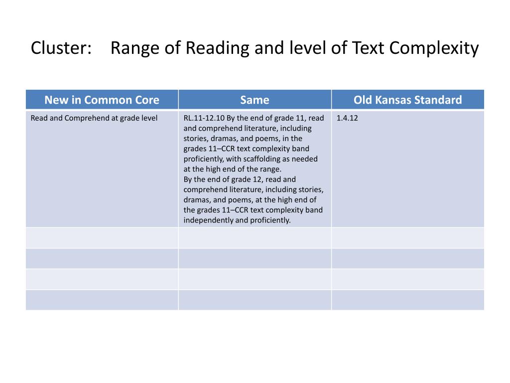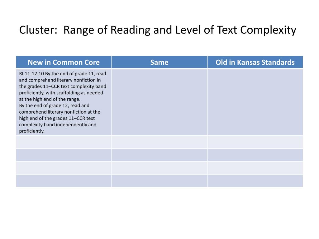 ELA – 11 & 12. Common Core Vs Kansas Standards. DOMAIN. Standards For Literature (RL). Cluster: Key Ideas and Details. p. 2. Cluster: Craft and Structure. p. 2. Cluster: Integration of Knowledge and Ideas. p. 2. Cluster: Range of Reading and level of Text Complexity. p. 2.