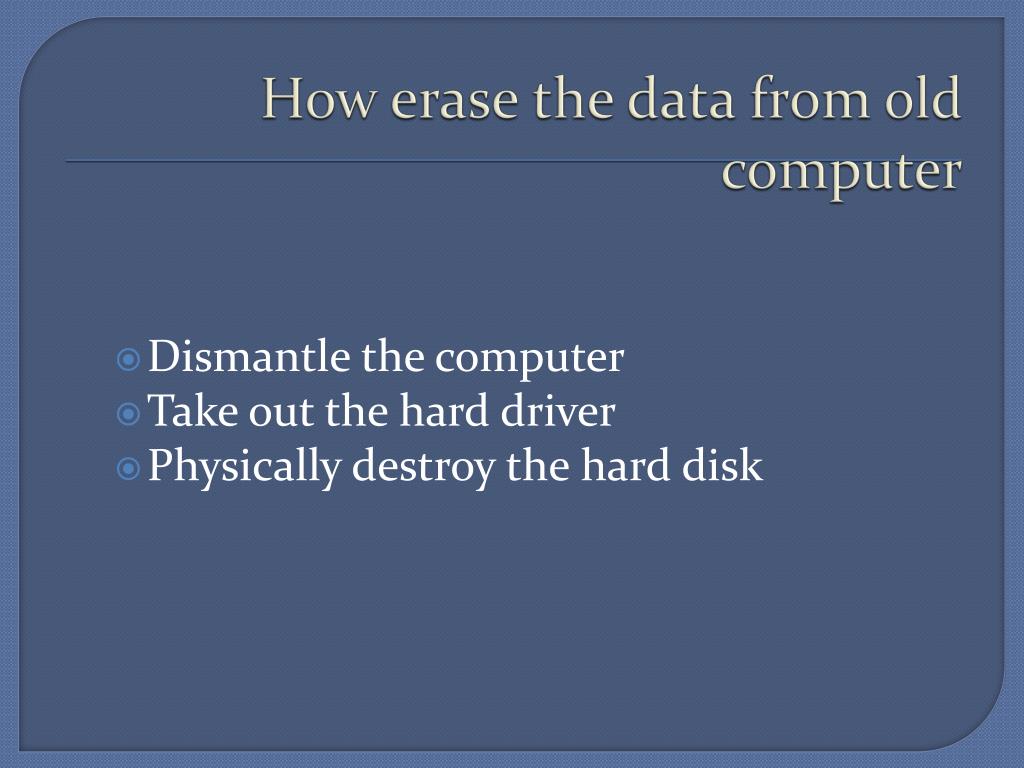 How erase the data from old computer Dismantle the computer Take out the hard driver Physically destroy the hard disk