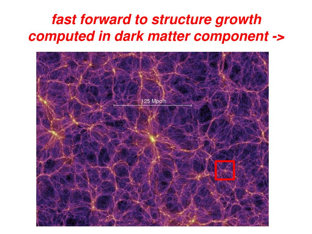 NB, fluctuation level only 10-5 at high redshift Cosmological Simulation:Start with WMAP CBR Sky • tot = 1, [=1.010 +-0.016] • cdm= 0.23 ± 0.01 • baryon = 0.046 ± 0.002 • lambda = 0.73 ± 0.02 • n = 0.963 ± 0.015 • H0 = 70.4 ± 1.3km/s/Mpc • 8 = 0.81 ± 0.02 • scat =0.087 ± 0.001 • (WMAP 7)