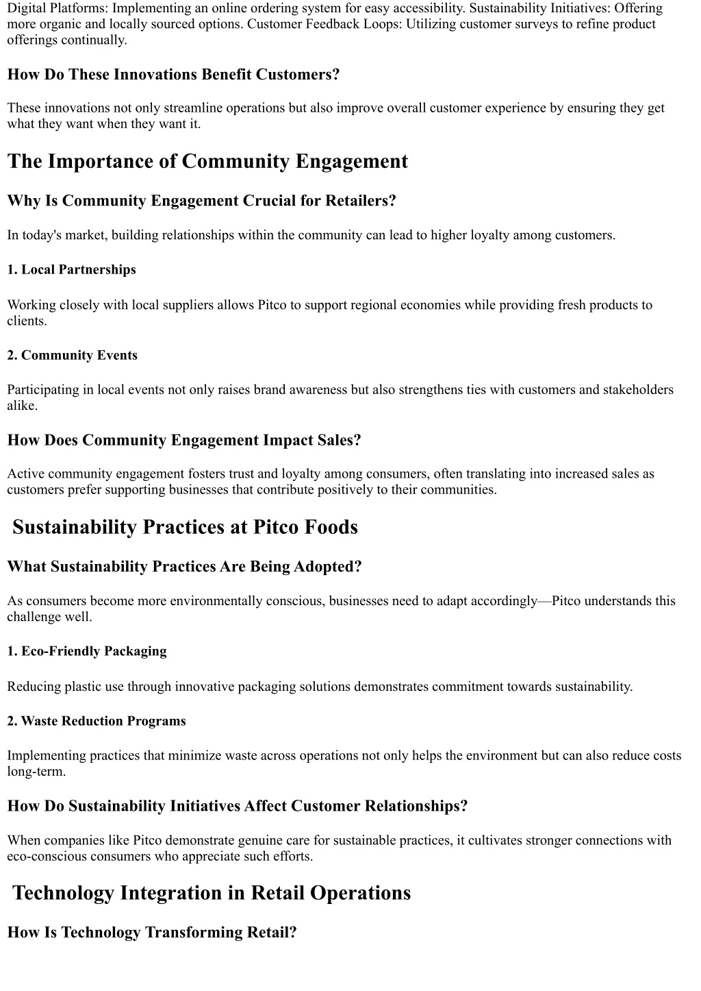 Digital Platforms: Implementing an online ordering system for easy accessibility. Sustainability Initiatives: Offering more organic and locally sourced options. Customer Feedback Loops: Utilizing customer surveys to refine product offerings continually. How Do These Innovations Benefit Customers? These innovations not only streamline operations but also improve overall customer experience by ensuring they get what they want when they want it. The Importance of Community Engagement Why Is Community Engagement Crucial for Retailers? In today's market, building relationships within the community can lead to higher loyalty among customers. 1. Local Partnerships Working closely with local suppliers allows Pitco to support regional economies while providing fresh products to clients. 2. Community Events Participating in local events not only raises brand awareness but also strengthens ties with customers and stakeholders alike. How Does Community Engagement Impact Sales? Active community engagement fosters trust and loyalty among consumers, often translating into increased sales as customers prefer supporting businesses that contribute positively to their communities. Sustainability Practices at Pitco Foods What Sustainability Practices Are Being Adopted? As consumers become more environmentally conscious, businesses need to adapt accordingly—Pitco understands this challenge well. 1. Eco-Friendly Packaging Reducing plastic use through innovative packaging solutions demonstrates commitment towards sustainability. 2. Waste Reduction Programs Implementing practices that minimize waste across operations not only helps the environment but can also reduce costs long-term. How Do Sustainability Initiatives Affect Customer Relationships? When companies like Pitco demonstrate genuine care for sustainable practices, it cultivates stronger connections with eco-conscious consumers who appreciate such efforts. Technology Integration in Retail Operations How Is Technology Transforming Retail?