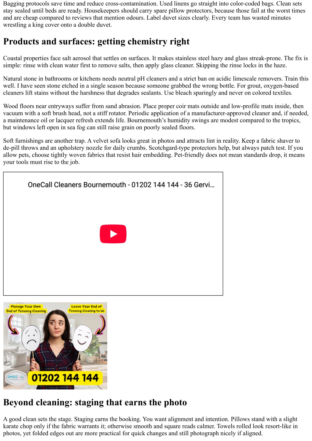 Bagging protocols save time and reduce cross-contamination. Used linens go straight into color-coded bags. Clean sets stay sealed until beds are ready. Housekeepers should carry spare pillow protectors, because those fail at the worst times and are cheap compared to reviews that mention odours. Label duvet sizes clearly. Every team has wasted minutes wrestling a king cover onto a double duvet. Products and surfaces: getting chemistry right Coastal properties face salt aerosol that settles on surfaces. It makes stainless steel hazy and glass streak-prone. The fix is simple: rinse with clean water first to remove salts, then apply glass cleaner. Skipping the rinse locks in the haze. Natural stone in bathrooms or kitchens needs neutral pH cleaners and a strict ban on acidic limescale removers. Train this well. I have seen stone etched in a single season because someone grabbed the wrong bottle. For grout, oxygen-based cleaners lift stains without the harshness that degrades sealants. Use bleach sparingly and never on colored textiles. Wood floors near entryways suffer from sand abrasion. Place proper coir mats outside and low-profile mats inside, then vacuum with a soft brush head, not a stiff rotator. Periodic application of a manufacturer-approved cleaner and, if needed, a maintenance oil or lacquer refresh extends life. Bournemouth’s humidity swings are modest compared to the tropics, but windows left open in sea fog can still raise grain on poorly sealed floors. Soft furnishings are another trap. A velvet sofa looks great in photos and attracts lint in reality. Keep a fabric shaver to de-pill throws and an upholstery nozzle for daily crumbs. Scotchgard-type protectors help, but always patch test. If you allow pets, choose tightly woven fabrics that resist hair embedding. Pet-friendly does not mean standards drop, it means your tools must rise to the job. OneCall Cleaners Bournemouth - 01202 144 144 - 36 Gervi OneCall Cleaners Bournemouth - 01202 144 144 - 36 Gervi… … Beyond cleaning: staging that earns the photo A good clean sets the stage. Staging earns the booking. You want alignment and intention. Pillows stand with a slight karate chop only if the fabric warrants it; otherwise smooth and square reads calmer. Towels rolled look resort-like in photos, yet folded edges out are more practical for quick changes and still photograph nicely if aligned.