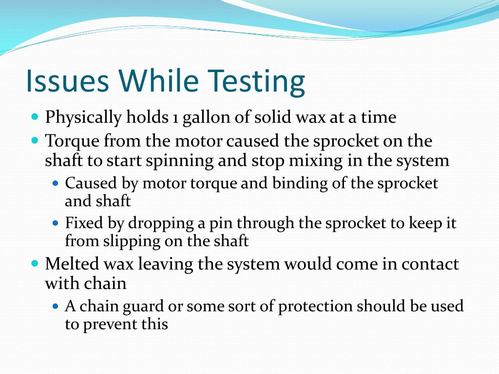 Issues While Testing • Physically holds 1 gallon of solid wax at a time • Torque from the motor caused the sprocket on the shaft to start spinning and stop mixing in the system • Caused by motor torque and binding of the sprocket and shaft • Fixed by dropping a pin through the sprocket to keep it from slipping on the shaft • Melted wax leaving the system would come in contact with chain • A chain guard or some sort of protection should be used to prevent this