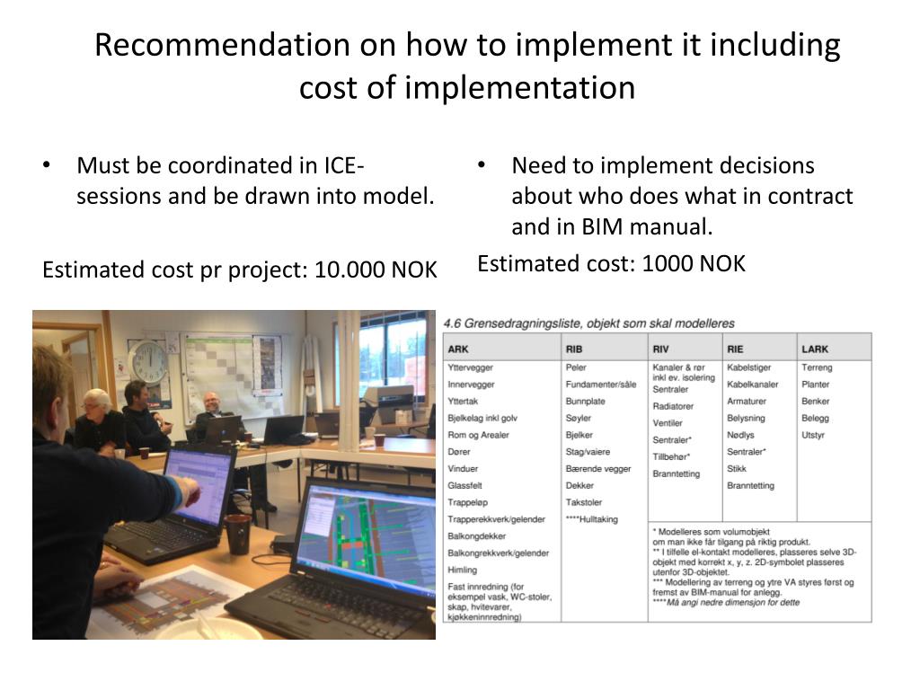Recommendation on how to implement it including cost of implementation • Must be coordinated in ICE-sessions and be drawn into model. Estimated cost pr project: 10.000 NOK • Need to implement decisions about who does what in contract and in BIM manual. Estimated cost: 1000 NOK