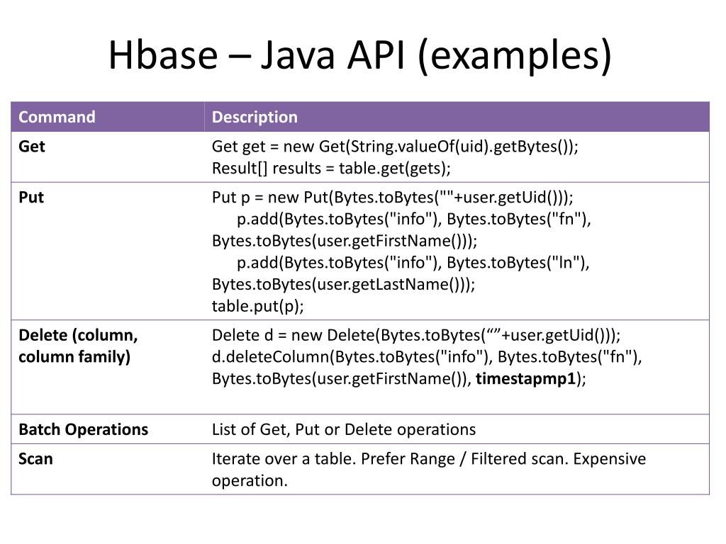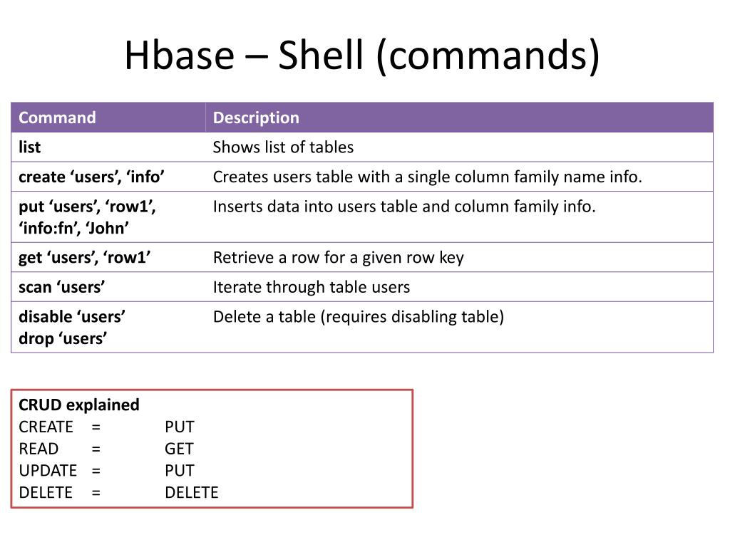 Hbase – Shell (commands) CRUD explained CREATE = PUT READ = GET UPDATE = PUT DELETE = DELETE