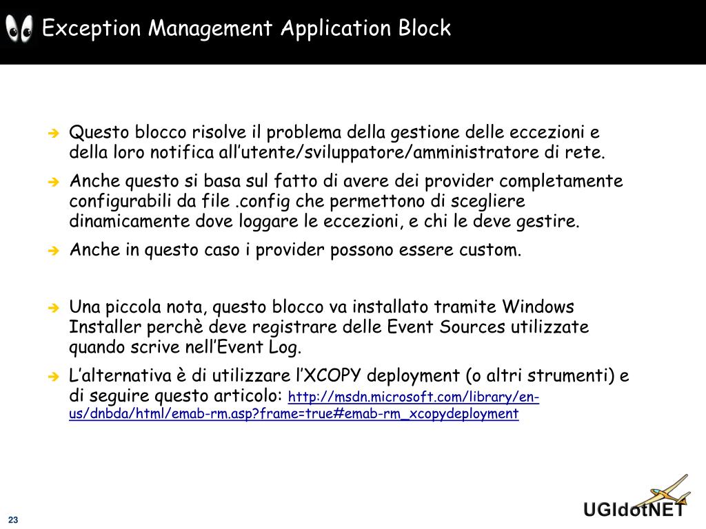 Exception Management Application Block • Questo blocco risolve il problema della gestione delle eccezioni e della loro notifica all’utente/sviluppatore/amministratore di rete. • Anche questo si basa sul fatto di avere dei provider completamente configurabili da file .config che permettono di scegliere dinamicamente dove loggare le eccezioni, e chi le deve gestire. • Anche in questo caso i provider possono essere custom. • Una piccola nota, questo blocco va installato tramite Windows Installer perchè deve registrare delle Event Sources utilizzate quando scrive nell’Event Log. • L’alternativa è di utilizzare l’XCOPY deployment (o altri strumenti) e di seguire questo articolo: http://msdn.microsoft.com/library/en-us/dnbda/html/emab-rm.asp?frame=true#emab-rm_xcopydeployment
