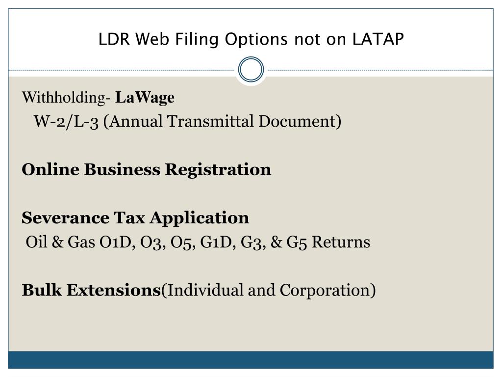 LDR Web Filing Options not on LATAP Withholding- LaWage W-2/L-3 (Annual Transmittal Document) Online Business Registration Severance Tax Application Oil & Gas O1D, O3, O5, G1D, G3, & G5 Returns Bulk Extensions(Individual and Corporation)