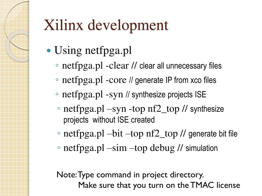 Xilinx development • Using netfpga.pl • netfpga.pl -clear // clear all unnecessary files • netfpga.pl -core // generate IP from xco files • netfpga.pl -syn// synthesize projects ISE • netfpga.pl –syn -top nf2_top // synthesize projects without ISE created • netfpga.pl –bit –top nf2_top // generate bit file • netfpga.pl –sim –top debug // simulation Note: Type command in project directory. Make sure that you turn on the TMAC license