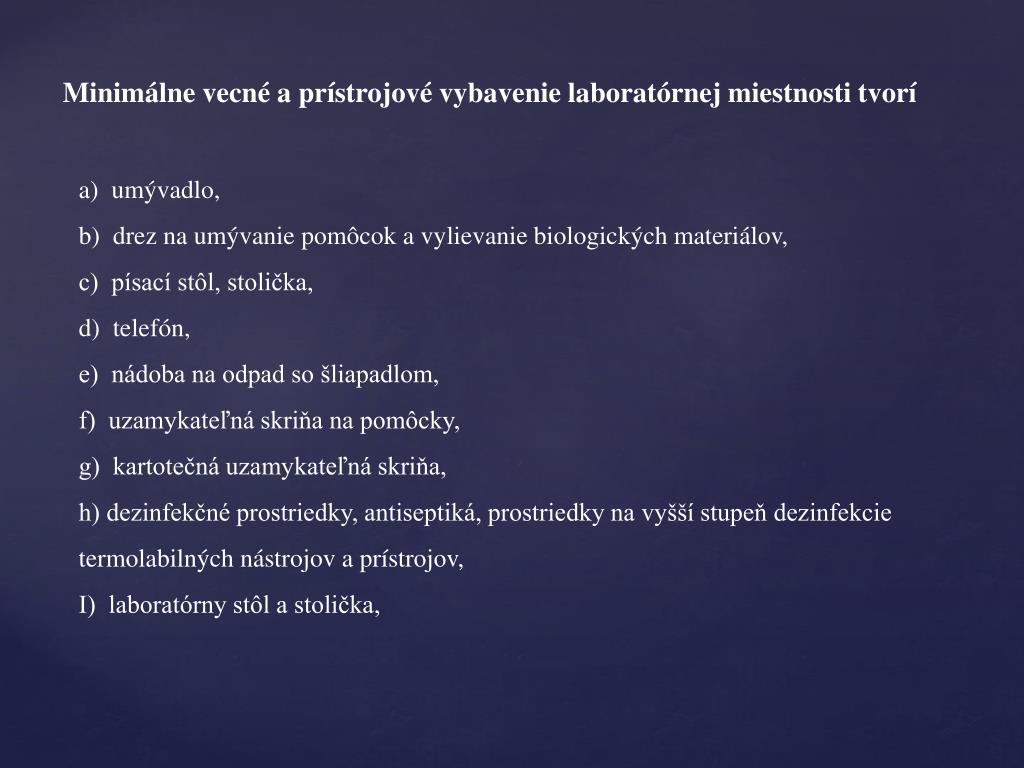 Minimálne vecné a prístrojové vybavenie laboratórnej miestnosti tvorí a) umývadlo, b) drez na umývanie pomôcok a vylievanie biologických materiálov, c) písací stôl, stolička, d) telefón, e) nádoba na odpad so šliapadlom, f) uzamykateľná skriňa na pomôcky, g) kartotečná uzamykateľná skriňa, h) dezinfekčné prostriedky, antiseptiká, prostriedky na vyšší stupeň dezinfekcie termolabilných nástrojov a prístrojov, I) laboratórny stôl a stolička,
