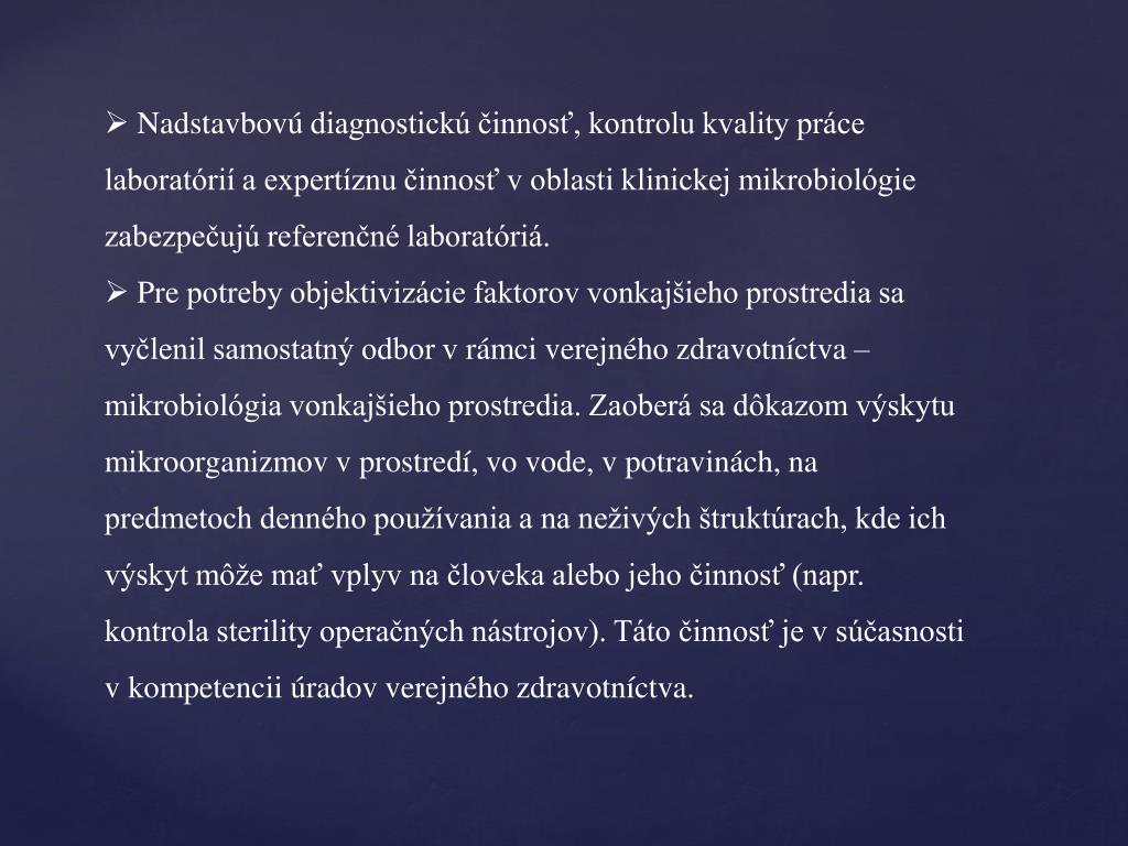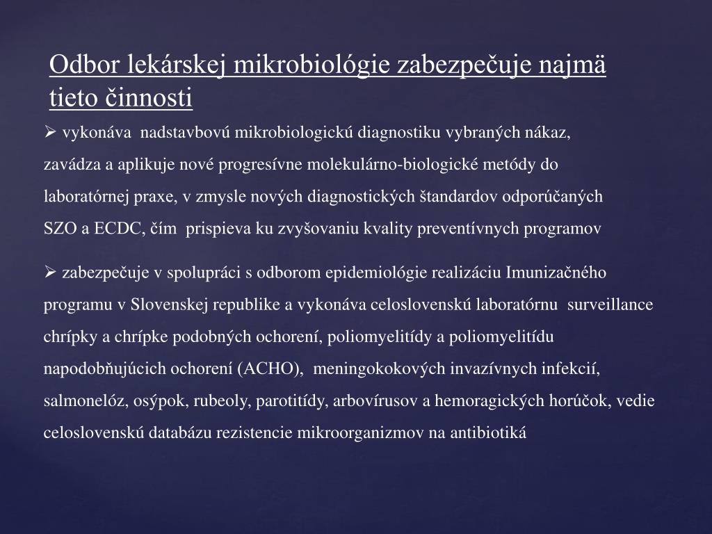 Činnosť odboruklinická mikrobiológia odborne a metodicky riadi MZ SR v spolupráci s hlavným odborníkom MZ SR pre odbor klinická mikrobiológia. • Zdravotnícky pracovníci laboratórií klinickej mikrobiológie poskytujú výsledky laboratórnych vyšetrení , ktoré slúžia pre vytvorenie surveillance vybraných infekčných ochorení v súlade s prioritami výkonu politikami verejného zdravia. • Pracovisko mikrobiológie hlási infekčné choroby podliehajúce hláseniu príslušného RUVZ.