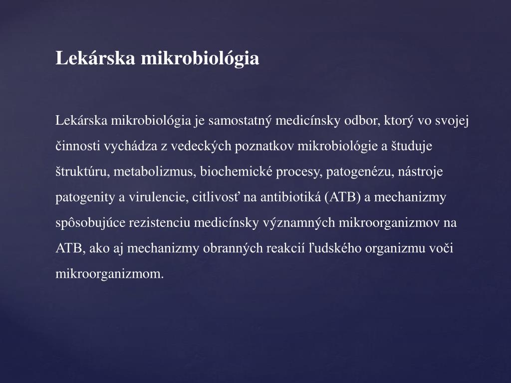 Lekárska mikrobiológia Lekárska mikrobiológia je samostatný medicínsky odbor, ktorý vo svojej činnosti vychádza z vedeckých poznatkov mikrobiológie a študuje štruktúru, metabolizmus, biochemické procesy, patogenézu, nástroje patogenity a virulencie, citlivosť na antibiotiká (ATB) a mechanizmy spôsobujúce rezistenciu medicínsky významných mikroorganizmov na ATB, ako aj mechanizmy obranných reakcií ľudského organizmu voči mikroorganizmom.
