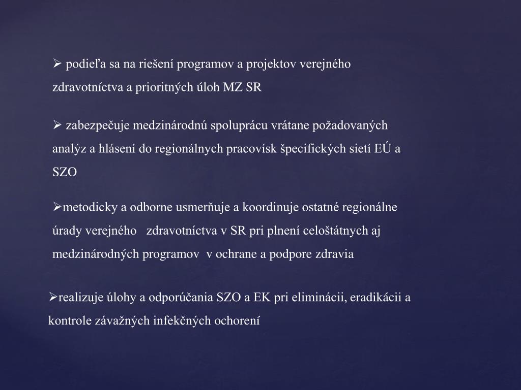 podieľa sa na riešení programov a projektov verejného zdravotníctva a prioritných úloh MZ SR • zabezpečuje medzinárodnú spoluprácu vrátane požadovaných analýz a hlásení do regionálnych pracovísk špecifických sietí EÚ a SZO • metodicky a odborne usmerňuje a koordinuje ostatné regionálne úrady verejného zdravotníctva v SR pri plnení celoštátnych aj medzinárodných programov v ochrane a podpore zdravia • realizuje úlohy a odporúčania SZO a EK pri eliminácii, eradikácii a kontrole závažných infekčných ochorení