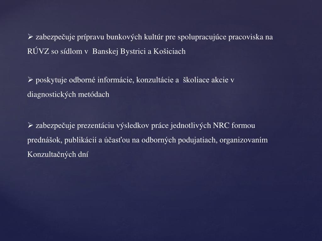 zabezpečuje prípravu bunkových kultúr pre spolupracujúce pracoviska na RÚVZ so sídlom v Banskej Bystrici a Košiciach • poskytuje odborné informácie, konzultácie a školiace akcie v diagnostických metódach • zabezpečuje prezentáciu výsledkov práce jednotlivých NRC formou prednášok, publikácií a účasťou na odborných podujatiach, organizovaním Konzultačných dní
