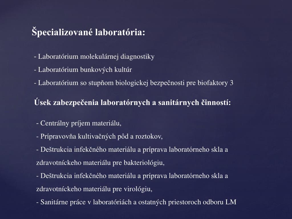 Špecializované laboratória: - Laboratórium molekulárnej diagnostiky - Laboratórium bunkových kultúr - Laboratórium so stupňom biologickej bezpečnosti pre biofaktory 3 Úsek zabezpečenia laboratórnych a sanitárnych činností: • - Centrálny príjem materiálu, • - Prípravovňa kultivačných pôd a roztokov, • - Deštrukcia infekčného materiálu a príprava laboratórneho skla a zdravotníckeho materiálu pre bakteriológiu, • - Deštrukcia infekčného materiálu a príprava laboratórneho skla a zdravotníckeho materiálu pre virológiu, • - Sanitárne práce v laboratóriách a ostatných priestoroch odboru LM