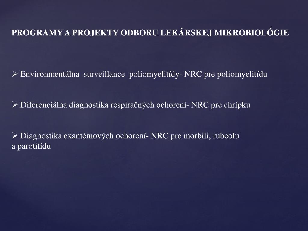 PROGRAMY A PROJEKTY ODBORU LEKÁRSKEJ MIKROBIOLÓGIE • Environmentálna surveillancepoliomyelitídy- NRC pre poliomyelitídu • Diferenciálna diagnostika respiračných ochorení- NRC pre chrípku • Diagnostika exantémových ochorení- NRC pre morbili, rubeolu a parotitídu