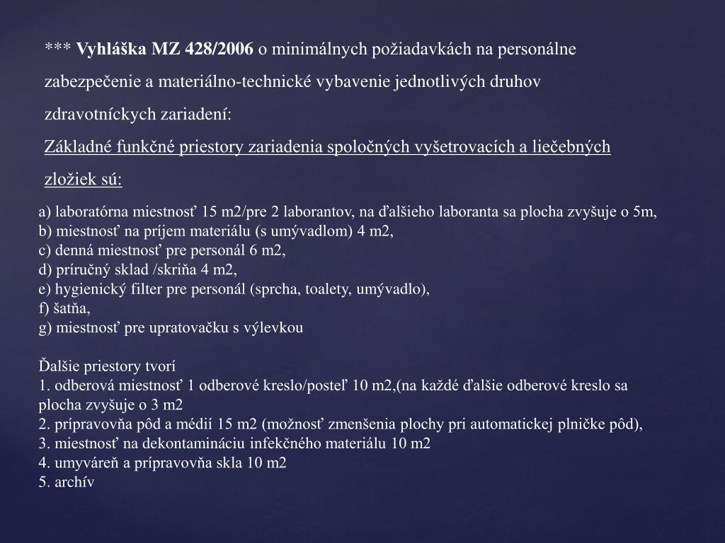 *** Vyhláška MZ 428/2006 o minimálnych požiadavkách na personálne zabezpečenie a materiálno-technické vybavenie jednotlivých druhov zdravotníckych zariadení: Základné funkčné priestory zariadenia spoločných vyšetrovacích a liečebných zložiek sú: a) laboratórna miestnosť 15 m2/pre 2 laborantov, na ďalšieho laboranta sa plocha zvyšuje o 5m, b) miestnosť na príjem materiálu (s umývadlom) 4 m2, c) denná miestnosť pre personál 6 m2, d) príručný sklad /skriňa 4 m2, e) hygienický filter pre personál (sprcha, toalety, umývadlo), f) šatňa, g) miestnosť pre upratovačku s výlevkou Ďalšie priestory tvorí 1. odberová miestnosť 1 odberové kreslo/posteľ 10 m2,(na každé ďalšie odberové kreslo sa plocha zvyšuje o 3 m2 2. prípravovňa pôd a médií 15 m2 (možnosť zmenšenia plochy pri automatickej plničke pôd), 3. miestnosť na dekontamináciu infekčného materiálu 10 m2 4. umyváreň a prípravovňa skla 10 m2 5. archív