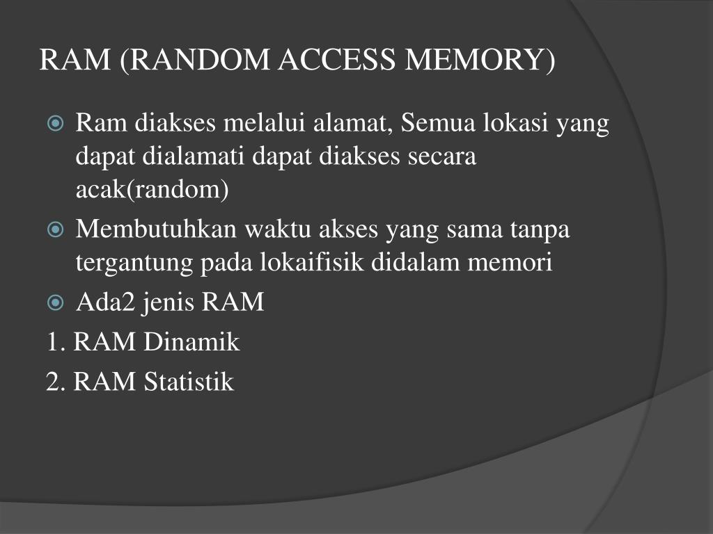 RAM (RANDOM ACCESS MEMORY) • Ram diaksesmelaluialamat, Semualokasi yang dapatdialamatidapatdiaksessecaraacak(random) • Membutuhkanwaktuakses yang samatanpatergantungpadalokaifisikdidalammemori • Ada2 jenis RAM 1. RAM Dinamik 2. RAM Statistik