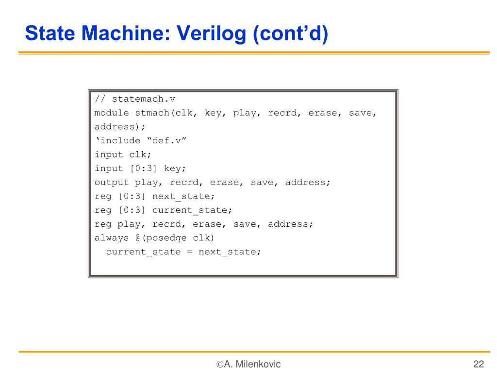 State Machine: Verilog (cont’d) // statemach.v module stmach(clk, key, play, recrd, erase, save, address); ‘include “def.v” input clk; input [0:3] key; output play, recrd, erase, save, address; reg [0:3] next_state; reg [0:3] current_state; reg play, recrd, erase, save, address; always @(posedge clk) current_state = next_state; A. Milenkovic