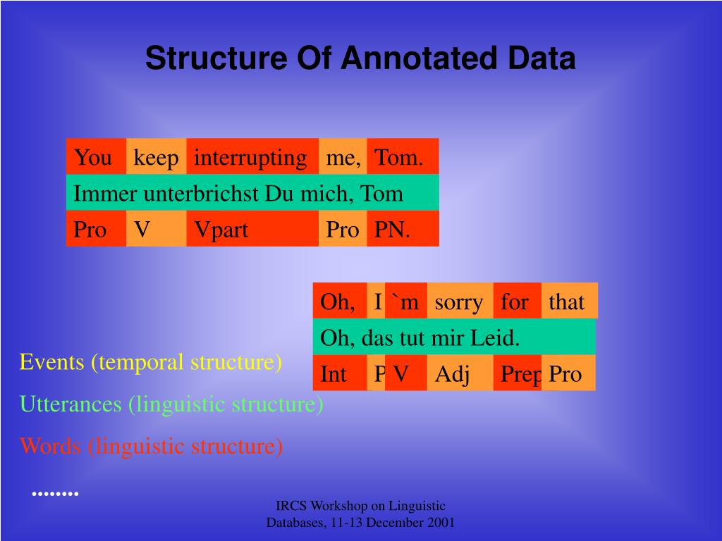 GER: Immer unterbrichst Du mich, Tom. POS: pro POS: v POS: vpart POS: pro POS: pn 0 a b 1 c 2 W: You W: keep W: interrupting W: me W: Tom U: You keep interrupting me, Tom. GER: Oh, das tut mir Leid. POS: int POS: pn POS: v 1 d e 2 3 W: Oh W: I W: 'm U: Oh, I'm sorry for that. Structure Of Annotated Data IRCS Workshop on Linguistic Databases, 11-13 December 2001