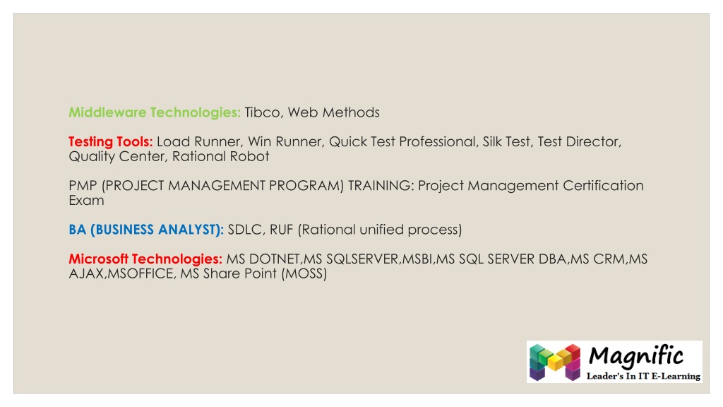 Middleware Technologies: Tibco, Web MethodsTesting Tools: Load Runner, Win Runner, Quick Test Professional, Silk Test, Test Director, Quality Center, Rational Robot PMP (PROJECT MANAGEMENT PROGRAM) TRAINING: Project Management Certification ExamBA (BUSINESS ANALYST): SDLC, RUF (Rational unified process)Microsoft Technologies: MS DOTNET,MS SQLSERVER,MSBI,MS SQL SERVER DBA,MS CRM,MS AJAX,MSOFFICE, MS Share Point (MOSS)