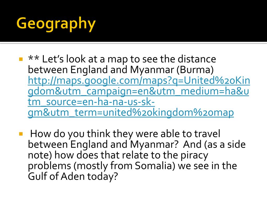 Geography • ** Let’s look at a map to see the distance between England and Myanmar (Burma) http://maps.google.com/maps?q=United%20Kingdom&utm_campaign=en&utm_medium=ha&utm_source=en-ha-na-us-sk-gm&utm_term=united%20kingdom%20map • How do you think they were able to travel between England and Myanmar? And (as a side note) how does that relate to the piracy problems (mostly from Somalia) we see in the Gulf of Aden today?