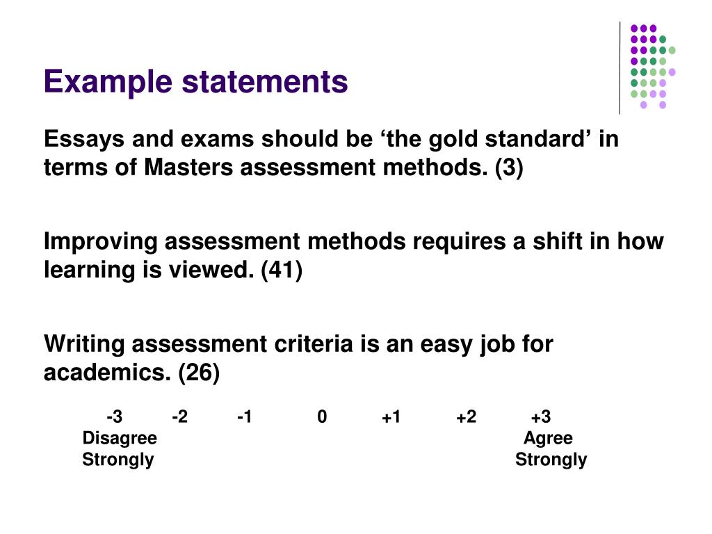 Example statements Essays and exams should be ‘the gold standard’ in terms of Masters assessment methods. (3) Improving assessment methods requires a shift in how learning is viewed. (41) Writing assessment criteria is an easy job for academics. (26) -3 -2 -1 0 +1 +2 +3 DisagreeAgree Strongly Strongly