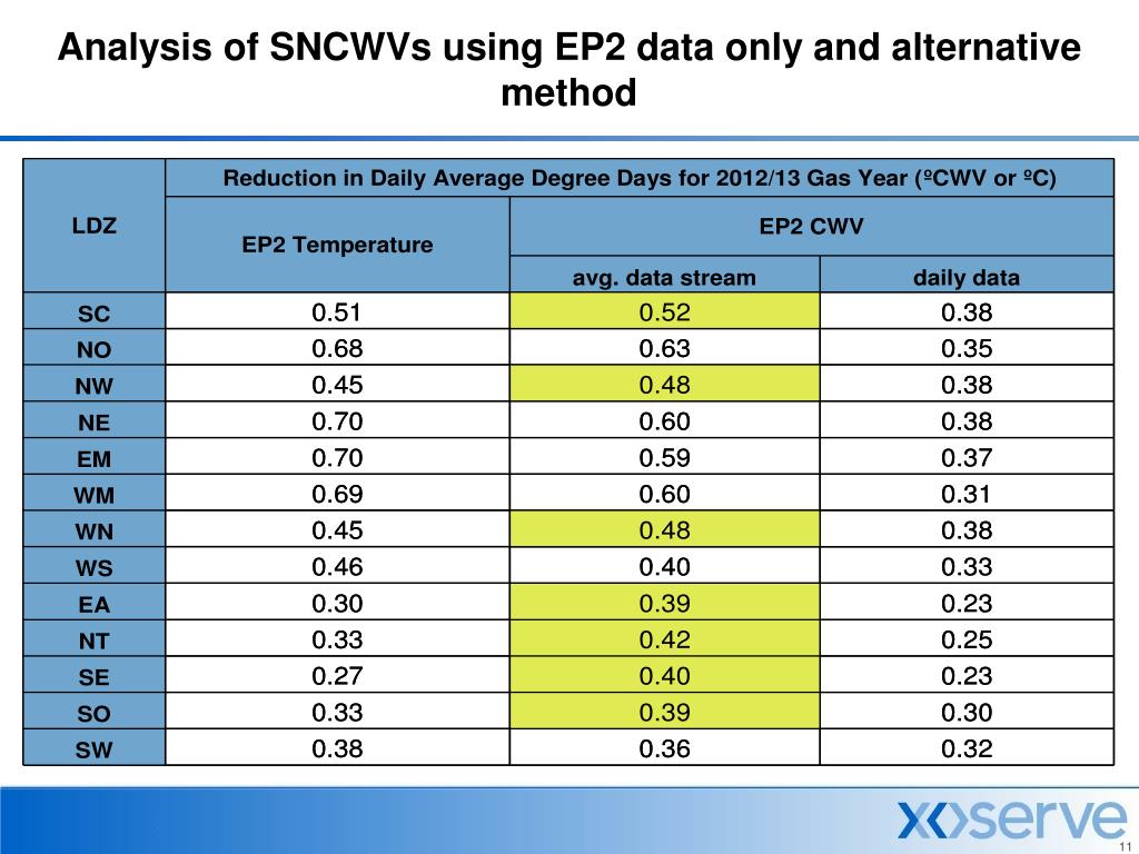 Analysis of SNCWVs using EP2 data only and alternative method • An EP2 CWV has been calculated for the middle year (2012/13) of the five years over which the seasonal normal basis will apply using EP2 forecast temperatures and EP2 wind speed averages (referred to as avg. data stream) • A CWV has been calculated for 2012/13 using an alternative approach relating individual days’ temperatures and wind speeds when computing wind chill (referred to as “daily data”) • An EP2 temperature only profile has also been calculated for 2012/13 (referred to as EP2 temperature) • A comparison can be made of the ensuing changes to the daily average degree days value over the full gas year. • In all cases, the appropriate threshold used for degree days is that for aggregate NDM demand. • The table on the next slide shows the changes to average daily degree days (over the gas year) relative to the current 17 year SNCWV for the various CWV cases and relative to a 17 year SNT for the temperature case.