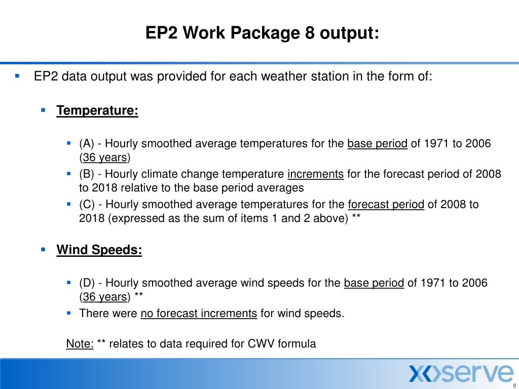 EP2 Work Package 8 output: • EP2 data output was provided for each weather station in the form of: • Temperature: • (A) - Hourly smoothed average temperatures for the base period of 1971 to 2006 (36 years) • (B) - Hourly climate change temperature increments for the forecast period of 2008 to 2018 relative to the base period averages • (C) - Hourly smoothed average temperatures for the forecast period of 2008 to 2018 (expressed as the sum of items 1 and 2 above) ** • Wind Speeds: • (D) - Hourly smoothed average wind speeds for the base period of 1971 to 2006 (36 years) ** • There were no forecast increments for wind speeds. Note: ** relates to data required for CWV formula