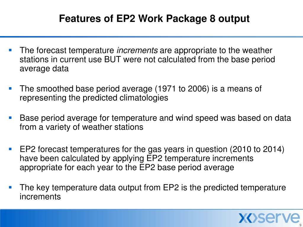 Features of EP2 Work Package 8 output • The forecast temperature increments are appropriate to the weather stations in current use BUT were not calculated from the base period average data • The smoothed base period average (1971 to 2006) is a means of representing the predicted climatologies • Base period average for temperature and wind speed was based on data from a variety of weather stations • EP2 forecast temperatures for the gas years in question (2010 to 2014) have been calculated by applying EP2 temperature increments appropriate for each year to the EP2 base period average • The key temperature data output from EP2 is the predicted temperature increments