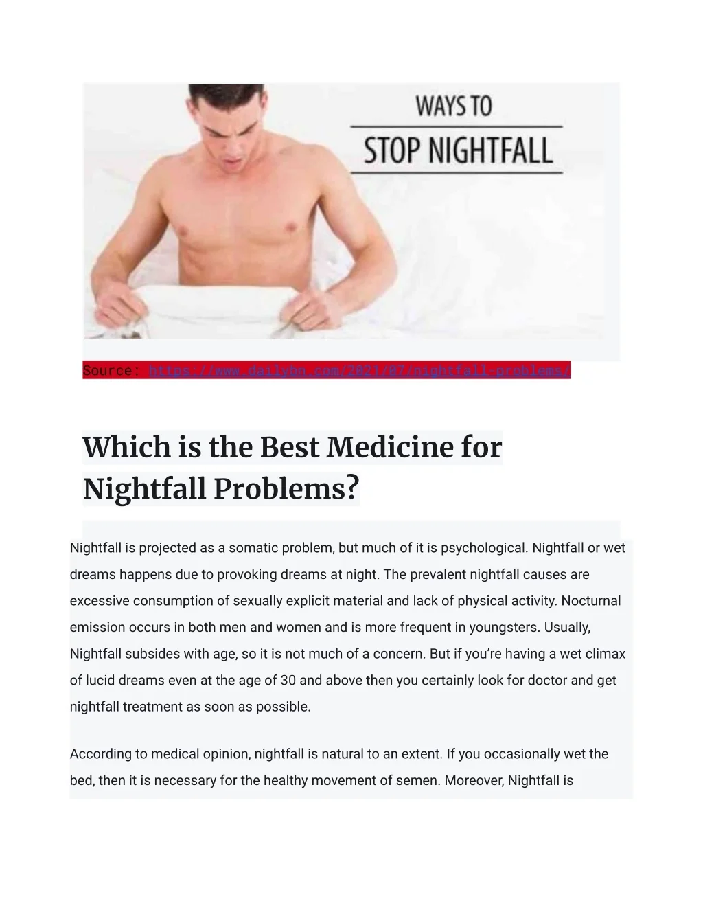 Source: https://www.dailybn.com/2021/07/nightfall-problems/ Which is the Best Medicine for Nightfall Problems? Nightfall is projected as a somatic problem, but much of it is psychological. Nightfall or wet dreams happens due to provoking dreams at night. The prevalent nightfall causes are excessive consumption of sexually explicit material and lack of physical activity. Nocturnal emission occurs in both men and women and is more frequent in youngsters. Usually, Nightfall subsides with age, so it is not much of a concern. But if you’re having a wet climax of lucid dreams even at the age of 30 and above then you certainly look for doctor and get nightfall treatment as soon as possible. According to medical opinion, nightfall is natural to an extent. If you occasionally wet the bed, then it is necessary for the healthy movement of semen. Moreover, Nightfall is