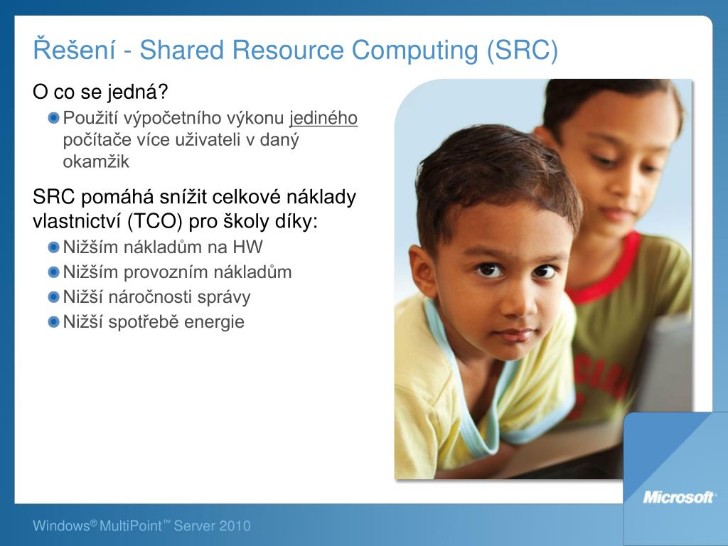 Řešení - Shared Resource Computing (SRC) • O co se jedná? • Použití výpočetního výkonujedinéhopočítače více uživateli v daný okamžik • SRC pomáhá snížit celkové náklady vlastnictví (TCO)pro školy díky: • Nižším nákladům na HW • Nižším provozním nákladům • Nižší náročnosti správy • Nižší spotřebě energie