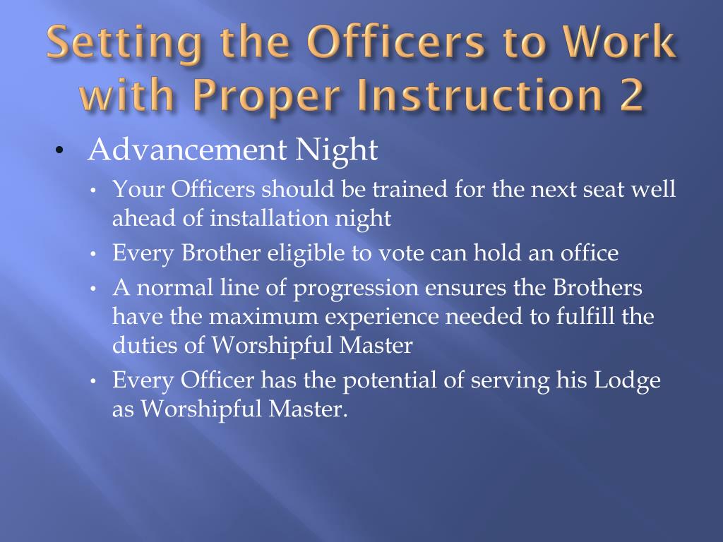 Setting the Officers to Work with Proper Instruction 2 • Advancement Night • Your Officers should be trained for the next seat well ahead of installation night • Every Brother eligible to vote can hold an office • A normal line of progression ensures the Brothers have the maximum experience needed to fulfill the duties of Worshipful Master • Every Officer has the potential of serving his Lodge as Worshipful Master.