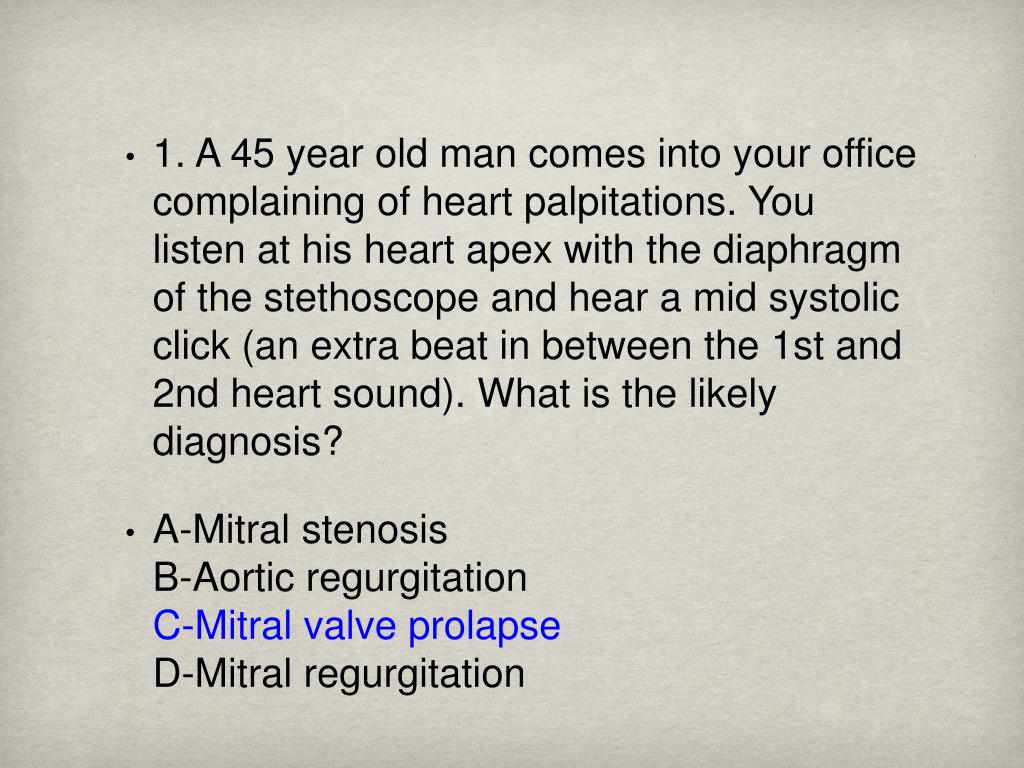 1. A 45 year old man comes into your office complaining of heart palpitations. You listen at his heart apex with the diaphragm of the stethoscope and hear a mid systolic click (an extra beat in between the 1st and 2nd heart sound). What is the likely diagnosis? • A-Mitral stenosisB-Aortic regurgitationC-Mitral valve prolapseD-Mitral regurgitation