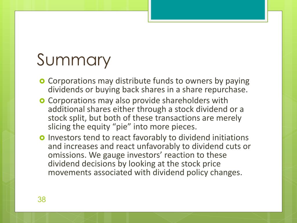 Summary Corporations may distribute funds to owners by paying dividends or buying back shares in a share repurchase. Corporations may also provide shareholders with additional shares either through a stock dividend or a stock split, but both of these transactions are merely slicing the equity “pie” into more pieces. Investors tend to react favorably to dividend initiations and increases and react unfavorably to dividend cuts or omissions. We gauge investors’ reaction to these dividend decisions by looking at the stock price movements associated with dividend policy changes.