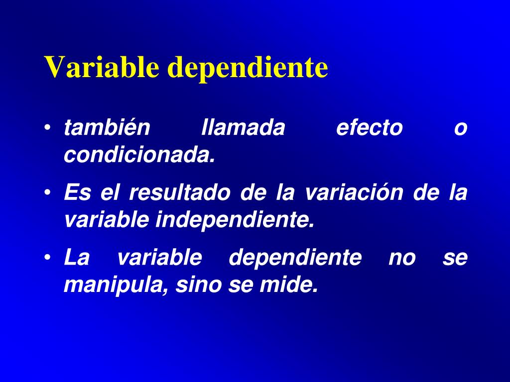 Variable dependiente • también llamada efecto o condicionada. • Es el resultado de la variación de la variable independiente. • La variable dependiente no se manipula, sino se mide.