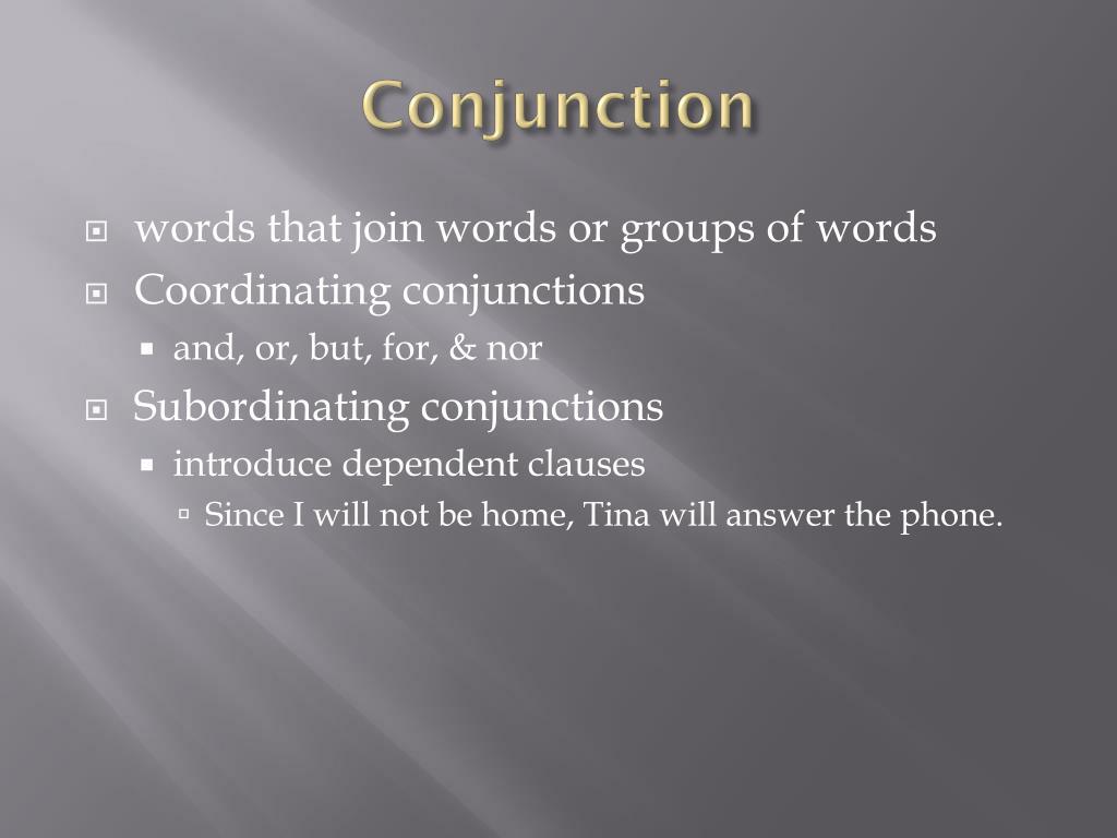 Conjunction • words that join words or groups of words • Coordinating conjunctions • and, or, but, for, & nor • Subordinating conjunctions • introduce dependent clauses • Since I will not be home, Tina will answer the phone.