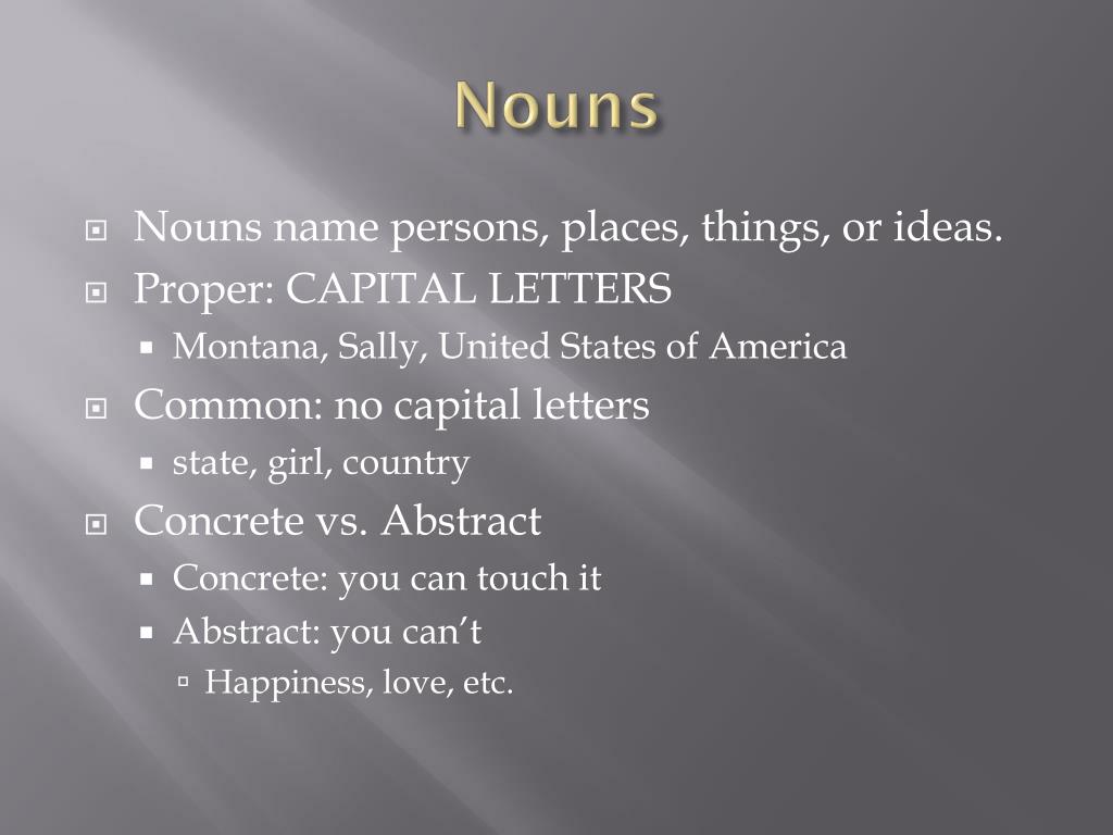 Nouns. Nouns name persons, places, things, or ideas . Proper: CAPITAL LETTERS Montana, Sally, United States of America Common: no capital letters state, girl, country Concrete vs. Abstract Concrete: you can touch it Abstract: you can’t Happiness, love, etc. . Pronoun.