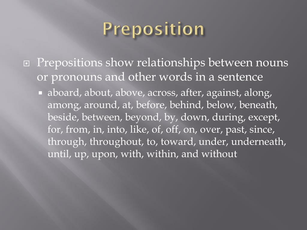 Preposition • Prepositions show relationships between nouns or pronouns and other words in a sentence • aboard, about, above, across, after, against, along, among, around, at, before, behind, below, beneath, beside, between, beyond, by, down, during, except, for, from, in, into, like, of, off, on, over, past, since, through, throughout, to, toward, under, underneath, until, up, upon, with, within, and without