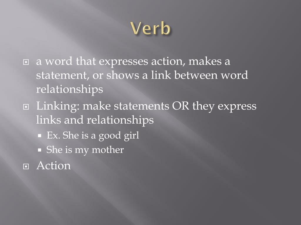 Verb • a word that expresses action, makes a statement, or shows a link between word relationships • Linking: make statements OR they express links and relationships • Ex. She is a good girl • She is my mother • Action