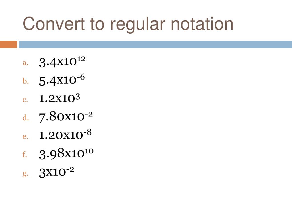 Convert to regular notation • 3.4x1012 • 5.4x10-6 • 1.2x103 • 7.80x10-2 • 1.20x10-8 • 3.98x1010 • 3x10-2